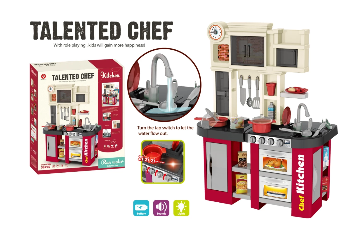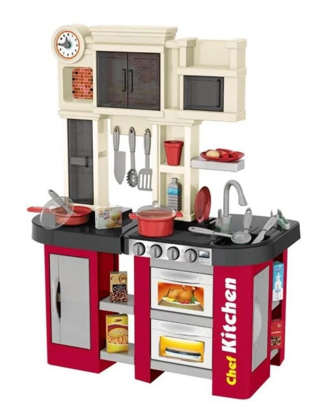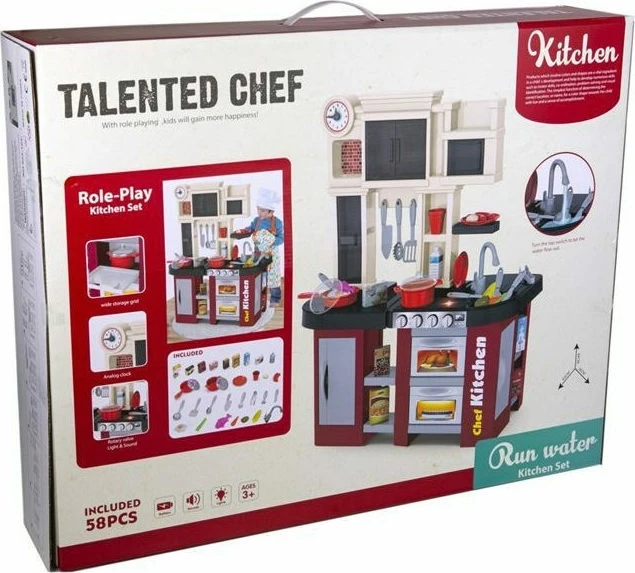 Κουζίνα Σετ Με 58 Τεμάχια Κουζινικά, Αναλογικό ρολόι και με τρεχούμενο νερό. (Έχει Ήχους Και Φώτα).