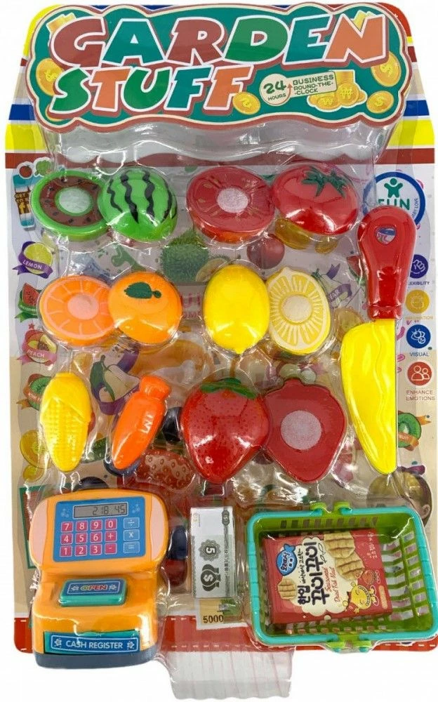 Ταμειακή Μηχανή Με Φρούτα Και Μαχαίρι Αν και στο παιδί σας αρέσει να βρίσκεται στην κουζίνα και να σας βοηθά, τότε αυτό το σετ είναι για εσάς. 1 κομμένο, πλαστικό καρπούζι 1 κομμένη, πλαστική ντομάτα 1 κομμένο, πλαστικό πορτοκάλι 1 κομμένο, πλαστικό λεμόνι 1 κομμένη, πλαστική φράουλα 1 πλαστικό καλαμπόκι…