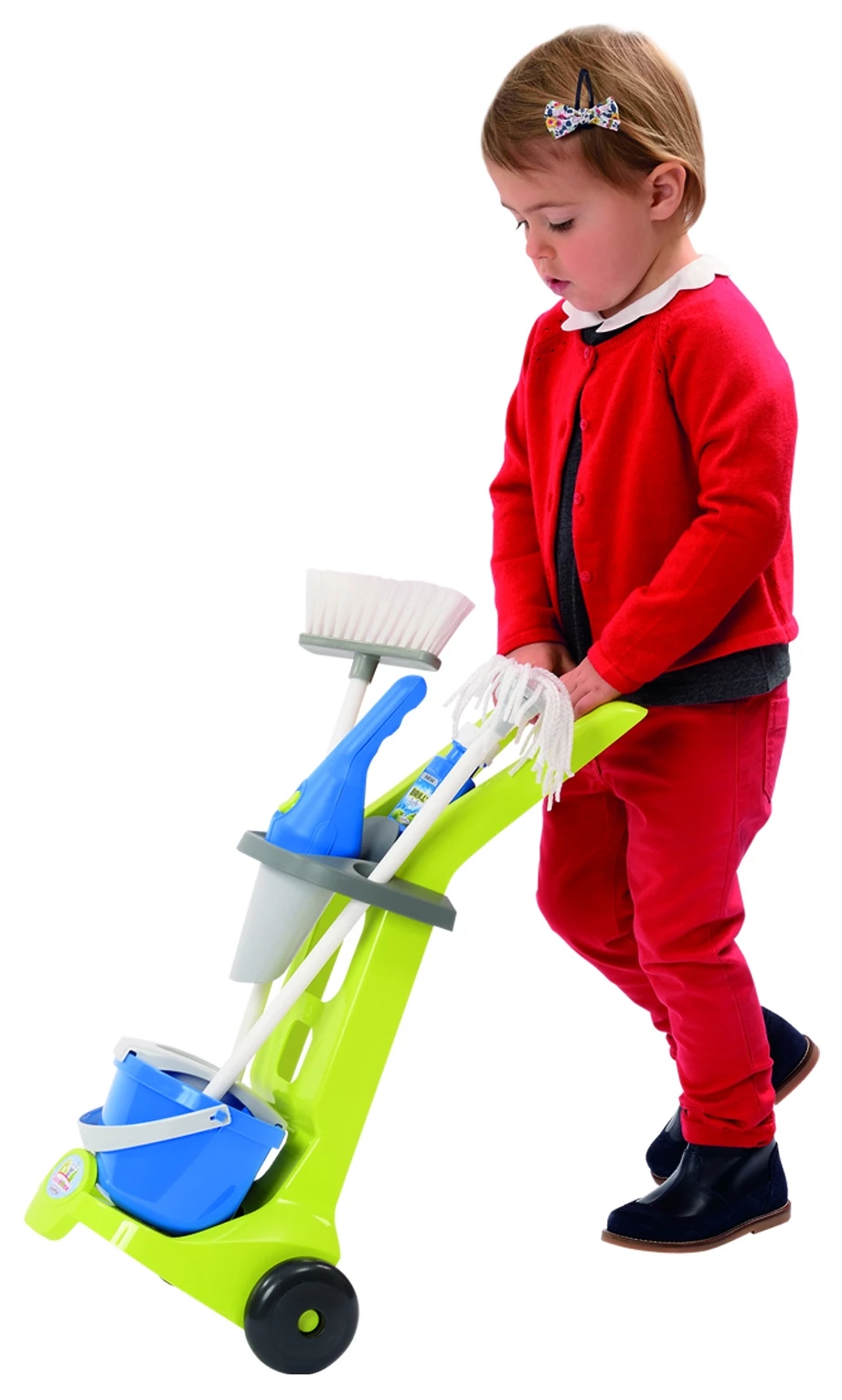 Ecoiffier Clean Home Παιδικό Σετ Τρόλευ Καθαρισμού Ένα καροτσάκι με όλα τα απαραίτητα αξεσουάρ για ένα καθαρό σπίτι: μια σφουγγαρίστρα και ένας κουβάς, μια σκούπα, μια φορητή ηλεκτρική σκούπα και 2 φιάλες προϊόντων καθαρισμού. Διαστάσεις: 26,5 x 21 x 56 εκ. Περιλαμβάνει 8 κομμάτια.