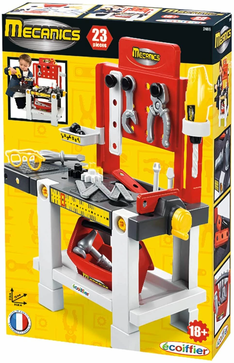 Ecoiffier Εργαλεία Και Πάγκος Εργαλείων Ένας πάγκος εργασίας γεμάτος αξεσουάρ όπως εργαλεία, καρφιά, γρανάζια, ακτινική μηχανή διάτρησης και 3 εναλλάξιμα τρυπάνια, εργαλειοθήκη και γυαλιά. Όλα αυτά τα αξεσουάρ επιτρέπουν στα παιδιά να παίζουν DIY με ασφάλεια. **Η συσκευασία ενδέχεται να διαφέρει ελαφρώς.