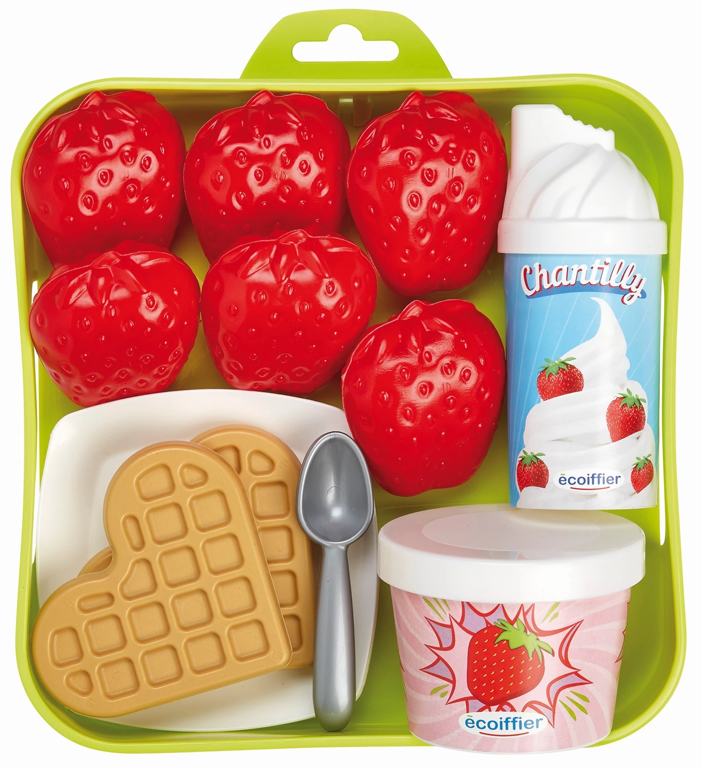 Ecoiffier κουζ.σετ δίσκος με φράουλες Κουζινικό σετ δίσκος με 6 φράουλες, 1 πιάτο σερβιρίσματος, 1 κουτάλι, 2 βάφλες, 1 σαντιγύ και 1 κύπελλο σερβιρίσματος.