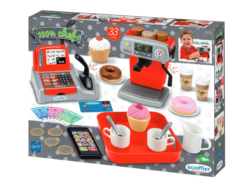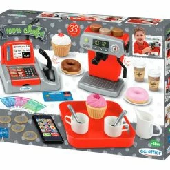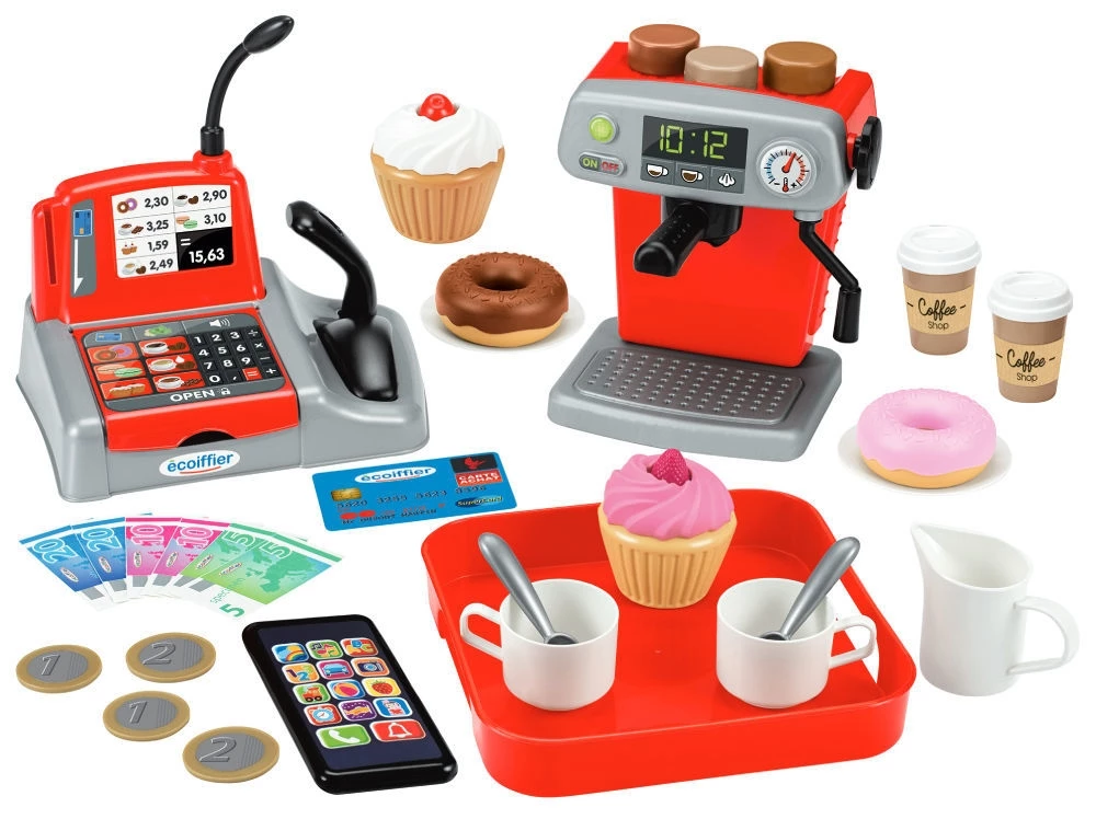 Ecoiffier Κουζινικά Σετ Ταμείο – Καφετέρια Αποτελείται από μια μηχανή καφέ, 3 ποικιλίες καφέ, μια ταμειακή μηχανή με μικρόφωνο, πιστωτική κάρτα, χρήματα και ένα δίσκο για να σερβίρετε τον καφέ μαζί με γλυκά.