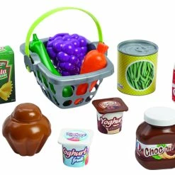 Πάγκος μίνι μάρκετ που περιλαμβάνει ένα καλάθι για τα ψώνια, ταμειακή μηχανή με σαρωτή barcode, μικρόφωνο, πιστωτική κάρτα και διάφορα προϊόντα όπως φρούτα και λαχανικά.