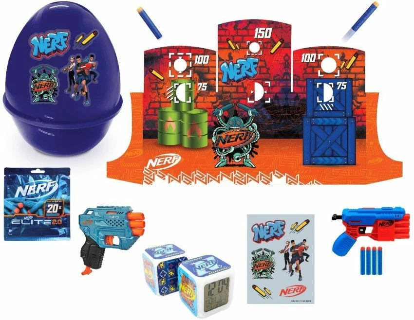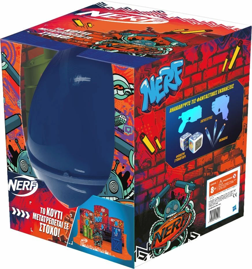 Nerf Αυγό Η συσκευασία μετατρέπεται σε τοίχο, γεμάτο με στόχους Nerf για να ζήσετε συναρπαστικά challenges με τους φίλους σας. Στο εσωτερικό θα βρείτε 2 εκτοξευτές και άλλες φανταστικές εκπλήξεις!