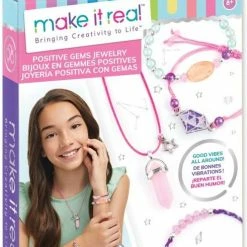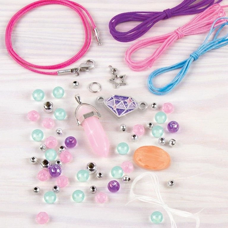 Make It Real- Gems Jewerly Περιλαμβάνει: – 1 κρεμαστό κόσμημα. – 1 μεταλλικό μενταγιόν με αστέρι. – 1 πλακέ μεταλλικό μενταγιόν. – 50 διαφορετικές χάντρες. – 3 χρώματα από νάιλον κορδόνια. – Ελαστικό κορδόνι. – 1 κορδόνι κολιέ.