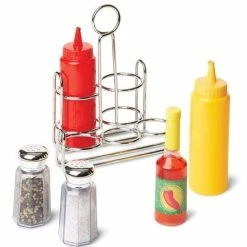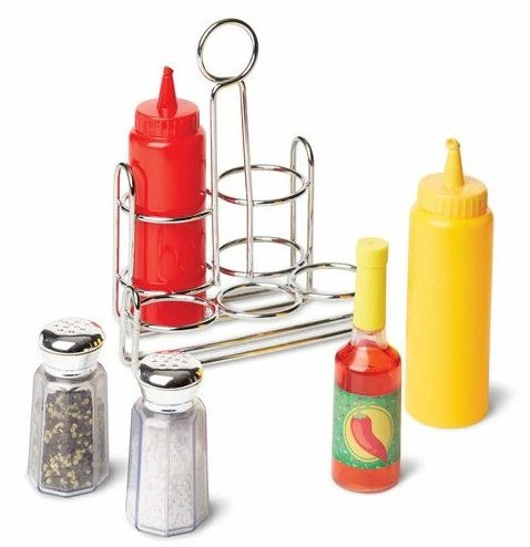 Ένα must-have για την άρτια εξοπλισμένη κουζίνα παιχνιδιού, αυτά τα καρυκεύματα ακούγονται και μοιάζουν αληθινά! Συσκευασμένο σε ένα εύχρηστο μεταλλικό κουτί για να κρατάτε τα πάντα οργανωμένα, το σετ έξι τεμαχίων περιλαμβάνει κέτσαπ, μουστάρδα, αλάτι, πιπέρι και καυτερή σάλτσα. Το καλύτερο από όλα: Το αλάτι και το πιπέρι πραγματικά «τινάζουν», η καυτερή σάλτσα πραγματικά «χύνει» και η κέτσαπ και η μουστάρδα «σκουρτσίζουν» κορδόνι! Αυτά τα υπέροχα ανθεκτικά κομμάτια παιχνιδιού είναι κατασκευασμένα για να διαρκούν σε αμέτρητες γαστρονομικές περιπέτειες.