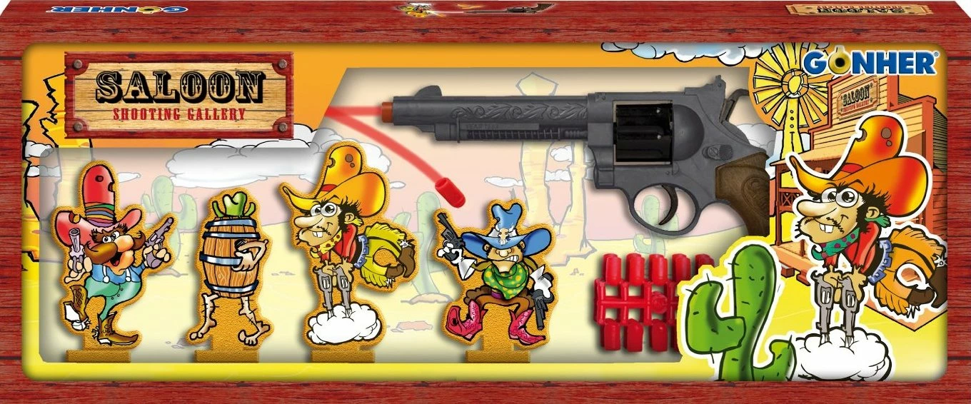 Παιδικό Σετ Όπλο Gonher Shooting Gallery με 6 φιγούρες! Η συσκευασία περιλαμβάνει: •1 όπλο •2 σετ καψούλια •6 φιγούρες