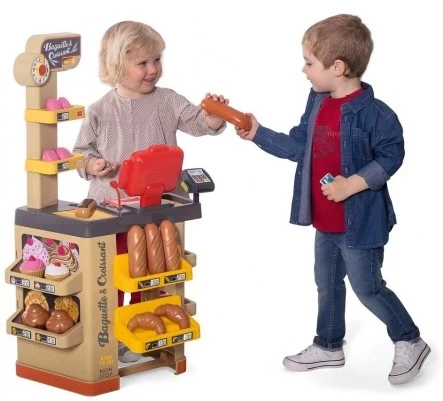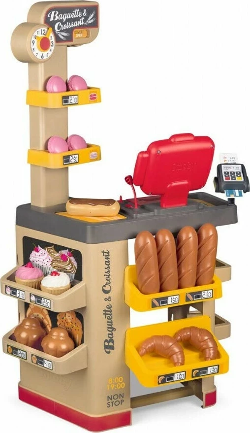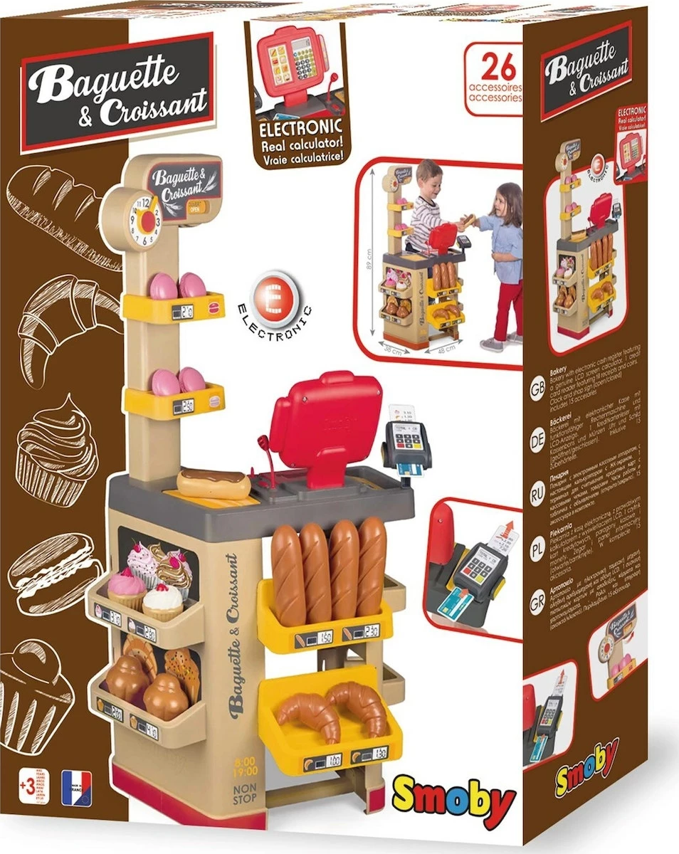 Smoby – Baguette and Croissant Bakery, πουλήστε τα καλύτερα κρουασάν και μπαγκέτες από το φούρνο. Καλώς ήλθατε στο δικό σας αρτοποιείο! Μπορείτε να πουλήσετε cupcakes, κρουασάν και σάντουιτς και να χρησιμοποιήσετε την πραγματική ταμειακή μηχανή και το μικρόφωνο που περιλαμβάνεται επίσης για να καλέσετε όλους τους πελάτες σας!