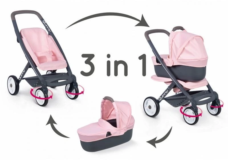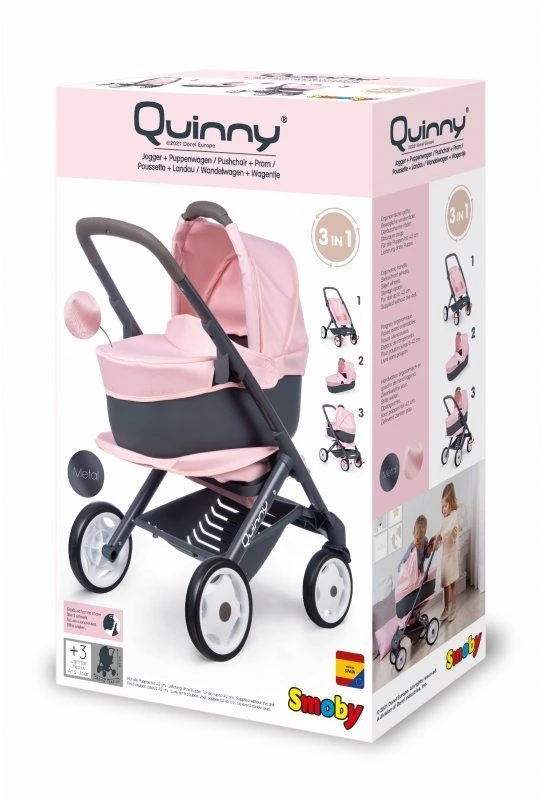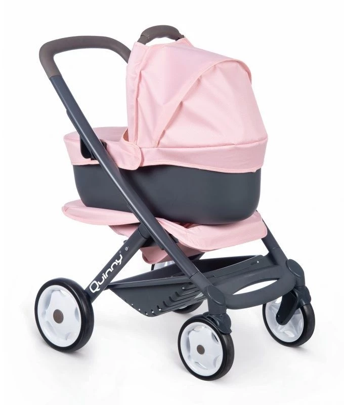 Smoby Καρότσι Κούκλας Quinny + Pram Pink Ένα ολοκληρωμένο καροτσάκι για να πάρετε την κούκλα του μωρού σας παντού μαζί σας! 3in1 αυτό το καροτσάκι σάς επιτρέπει να διαλέξετε την επιλογή που σας ταιριάζει ανά πάσα στιγμή! Με μεταλλικό σκελετό, αποθηκευτικό χώρο, εργονομική λαβή και αθόρυβους τροχούς. Κατάλληλο για κούκλες…